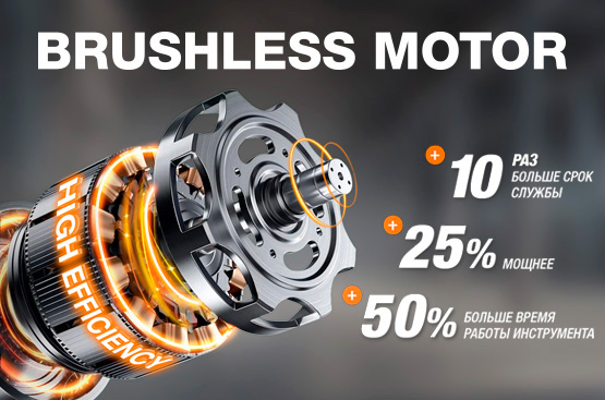 Обладает повышенной мощностью, развивает высокие обороты, обладает долгим сроком службы и все это при меньшем потреблении энергии, по сравнению с щеточными аналогами.